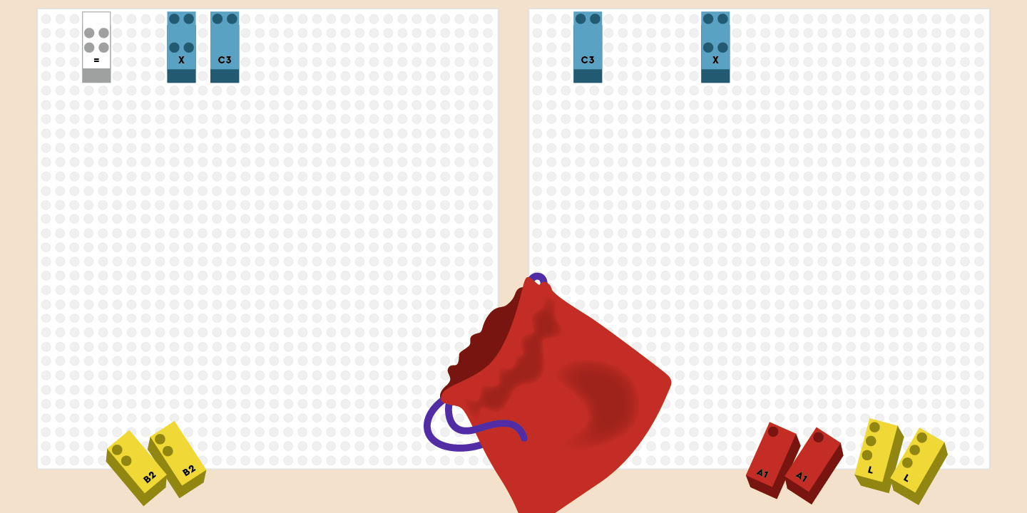 Taking turn, both players take all the bricks out of the bag and place them in a row on their baseplates, leaving a space between each brick.